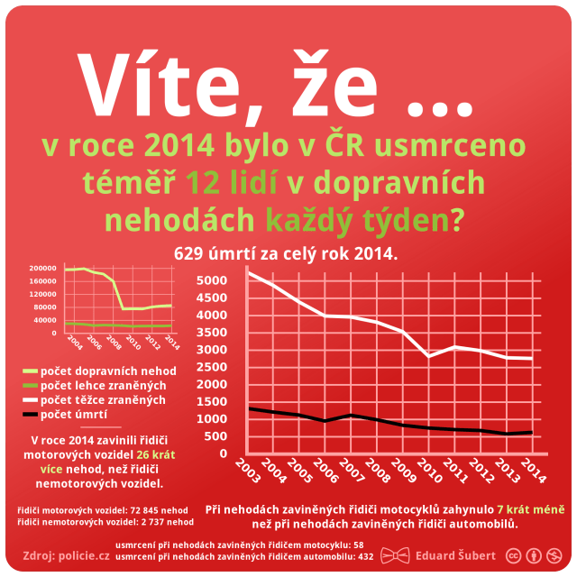 Víte, že … v roce 2014 bylo v ČR usmrceno téměř 12 lidí v dopravních nehodách každý týden? Napsal:Eduard Šubert 2015-06-292016-07-05 Víte, že … v roce 2014 bylo v ČR usmrceno téměř 12 lidí v dopravních nehodách každý týden? Sdílet na X (Otevře se v novém okně) X Sdílet na Facebooku (Otevře se v novém okně) Sdílet na Facebooku Share on Reddit (Otevře se v novém okně) Reddit Související